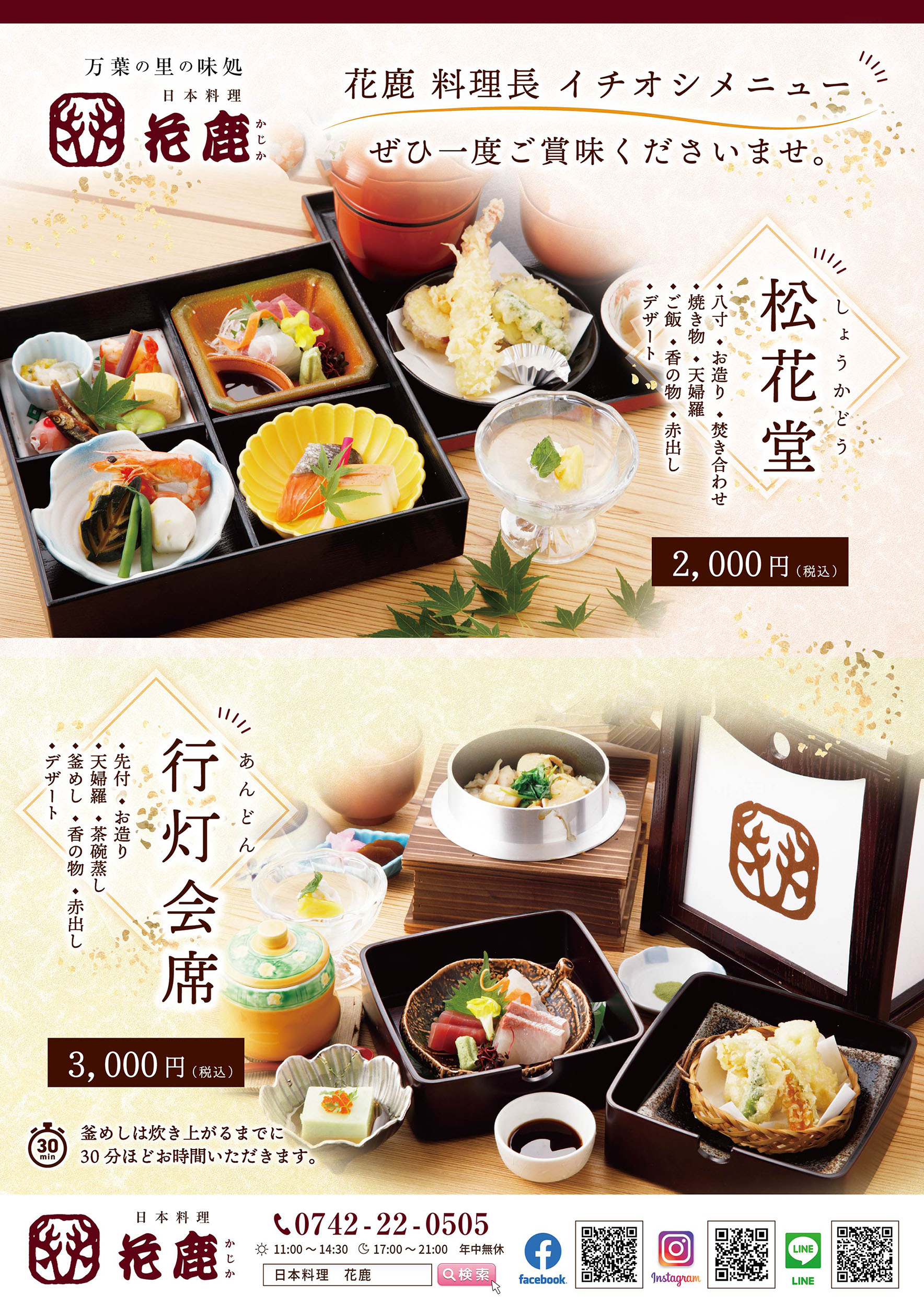 心ゆくまで日本料理の粋を堪能する お宮参り・米寿・還暦祝い・法事・法要 趣味の会など各種の慶弔・会合もご相談下さいませ。 奈良の日本料理 かじか花鹿